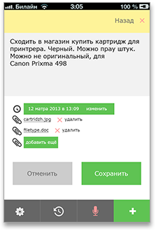 Бывает так, что важные идеи приходят в самое неподходящее время. Мы всегда думаем: "обязательно запомню и сделаю", но проходит время, и эти идеи полностью выветриваются из головы, заставляя нас мучительно вспоминать "Что же я хотел!?" Приложение дает возможность за 10 секунд сделать напоминание о любой мысли приходящей в голову.